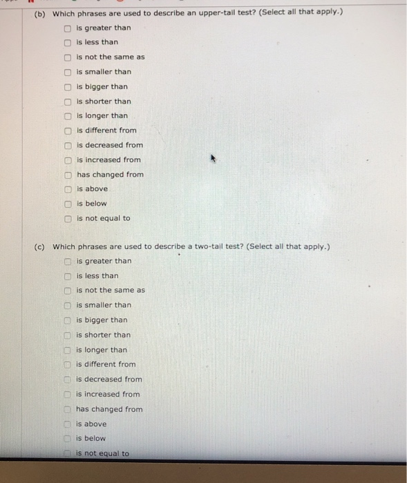 -3 points StatsByLO1 1710010. It is a lower one tail test. Select all that apply is greater than is less than is not the same as is smaller than is bigger than is shorter than is longer than is different from is decreased from is increased from has changed from is above is below is not equal to c Which phrases are used to describe a two-tail test.